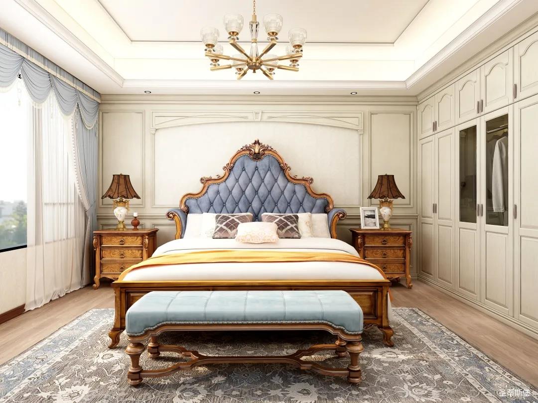 03主卧主卧设计运用现代的设计手法和材质还原了古典气质,以干练的线条传达着温馨的卧房。蜿蜒的波纹曲线,细腻精致的雕花,犹如随风起伏的浪花,在清澈蓝的床屏上跳跃,向静态空间展示着活跃的动态效果。曲直线条完美融合,打造一个灵动而又精致的生活空间。