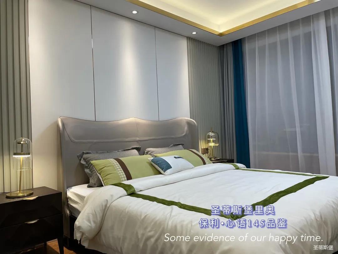 ▲次卧选用拼色,传达出一种空间平衡美。这里的色彩相比于主卧更加平缓,视觉上也多了份轻巧。床屏与背景饰面组合出疏密有序的线条比例,诠释着一个精工而不流于艳俗,纯净而不至于过渡简约的精致卧房。